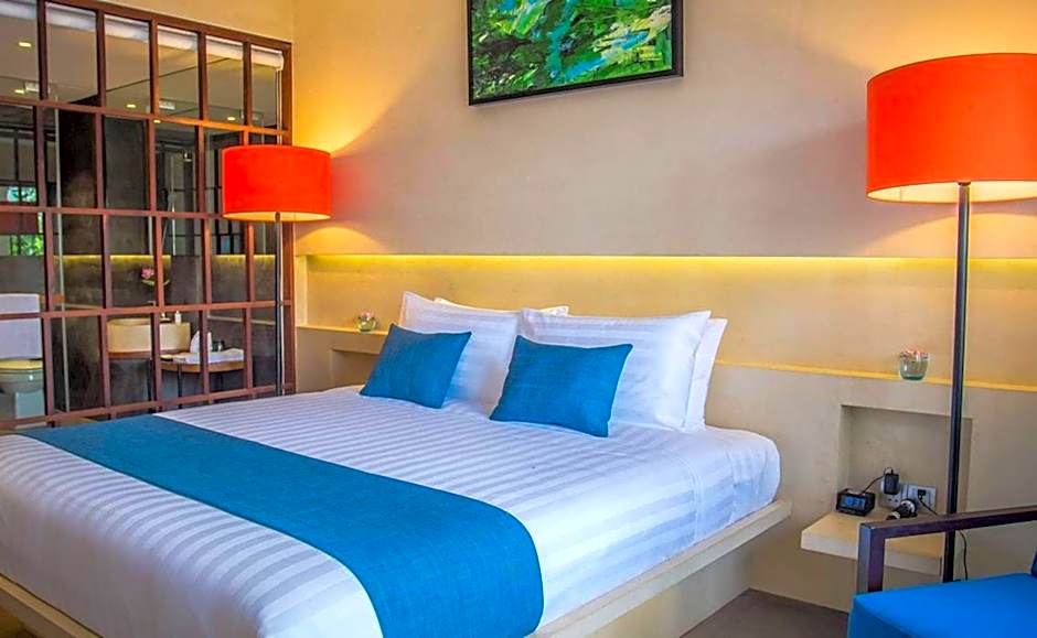This tastefully appointed, contemporary-styled room is located on the third floor of the hotel that overlooks views of the pool or the city. It features private courtyard access, stucco walls, and a separate lounge area with an attic-styled roof. The bathroom comes with a wooden floor and twin sinks, a free-standing shower and rain shower as well as a spacious bathtub for two. For guests’ convenience, there are a wooden working table, a chair, a 42-inch TV, and a large balcony.